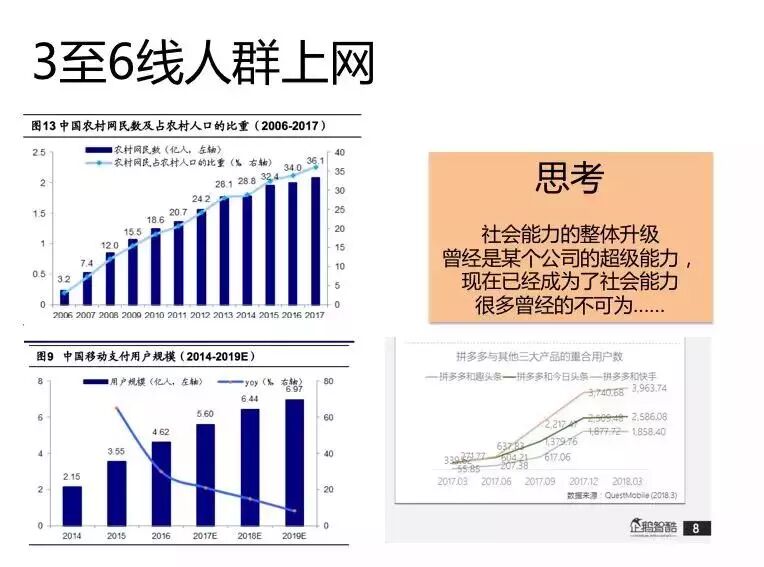 由红米所代表的低价的智能手机快速让三到六线用户上了网,农村互联网的渗透率提升。